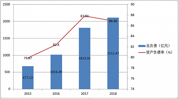 据泰禾集团历年财报显示,2015-2018年,泰禾集团的总负债呈上升趋势,分别为677.13亿元、1016.49亿元、1813.02亿元、2112.42亿元,对应的资产负债率分别为79.87%、82.40%、87.83%、86.88%。