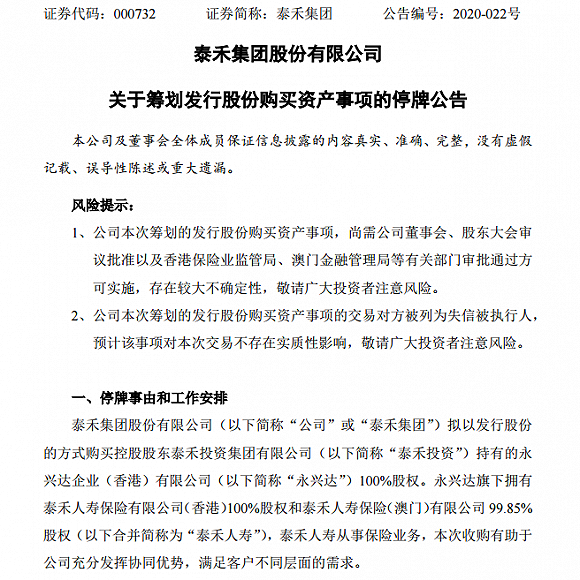 2020年4月28日,泰禾集团发布停牌公告,拟定以发行股份的方式购买控股股东泰禾投资集团有限公司(简称“泰禾投资”)所间接持有的保险业务相关资产,并在5月14日前召开董事会审议重组预案并申请复牌。
