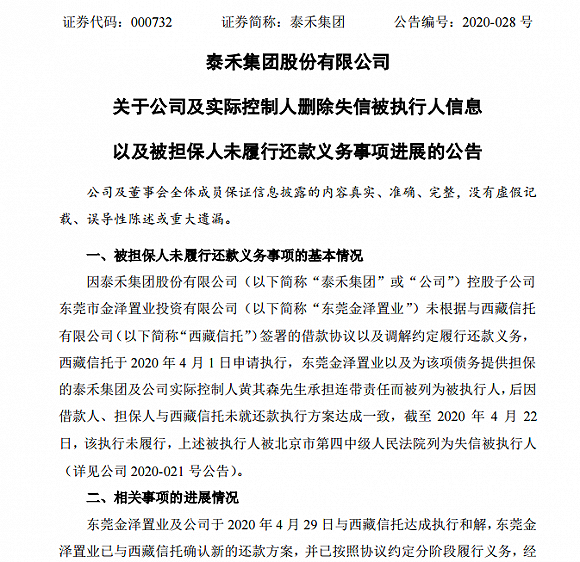 4月29日,东莞金泽与西藏信托达成和解。随后,西藏信托向北京市第四中级人民法院申请,东莞金泽置业、泰禾集团与公司实际控制人黄其森先生的该项失信被执行人信息已删除。