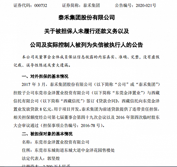 4天后,泰禾集团发布一则公告,承认该则消息的真实性,也就是,黄其森确认为失信执行人,据泰禾集团披露了关于泰禾集团子公司东莞市金泽置业投资有限公司未履行还款义务,以及泰禾集团及实际控制人黄其森被列为失信被执行人的公告显示,2017年3月,泰禾集团控股子公司东莞市金泽置业投资有限公司(以下简称“东莞金泽置业”)与西藏信托有限公司签订《贷款合同》,西藏信托向东莞金泽置业发放贷款8亿元,用于项目开发。泰禾集团为其子公司东莞市金泽置业投资有限公司贷款提供连带责任担保。