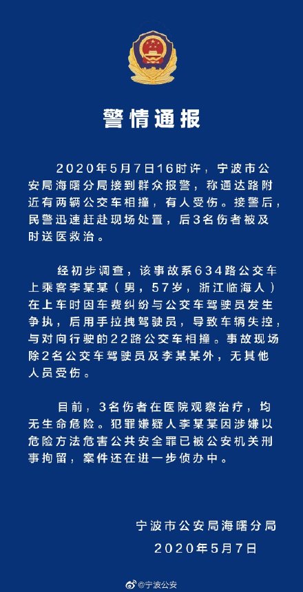 宁波市公安局海曙分局5月7日发布警情通报,称一57岁男子上车时因车费纠纷与公交车驾驶员发生争执,后用手拉拽驾驶员,导致车辆失控,与对向行驶的22路公交车相撞。事故现场除2名公交车驾驶员及李某某外,无其他人员受伤。