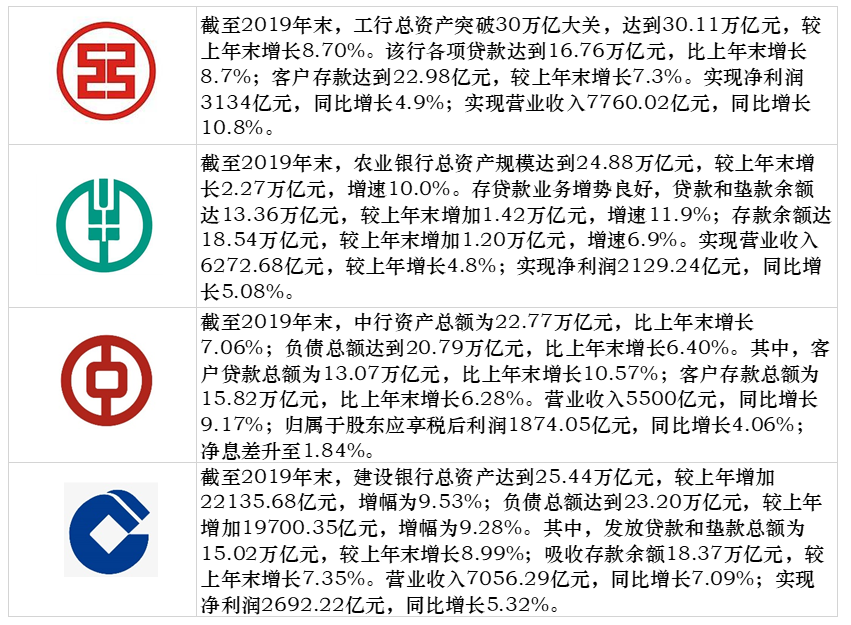 合计来看,四大行19年的资产总额为103.2亿元,19年利润合计为9973.98亿元,平均增速达5.05%。