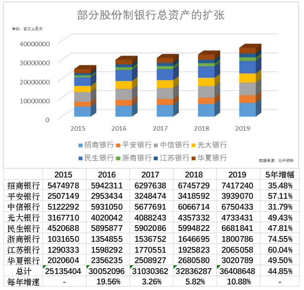 再看看股份制银行,以8家股份制银行为例,在2015到2019年5年间,8家银行的总资产增长幅度达44.85%。