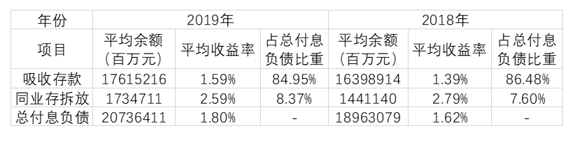 从负债端看,2019年,流动性分层使得银行间市场的资金成本降低,多数银行因此改善了付息负债成本。但对农行来说,作为付息负债主体的存款成本提升,推升了总体的负债成本。由于市场上结构性存款的广泛存在,存款成本较为刚性,难有下降空间。倘若流动性问题在未来发生扭转,现有的净利差如何保证?