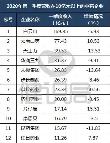 所有营收超过10亿元的中药企业12家。其中,白云山、云南白药、天士力、华润三九超过30亿元,分别为169.85亿元、77.4亿元、39.5亿元、31.4亿元。