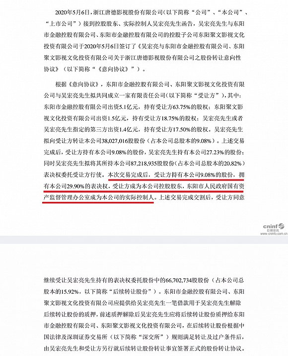 5月6日,唐德影视发布关于控股股东、实际控制人吴宏亮《股份转让意向性协议》暨控制权变更的提示性公告。