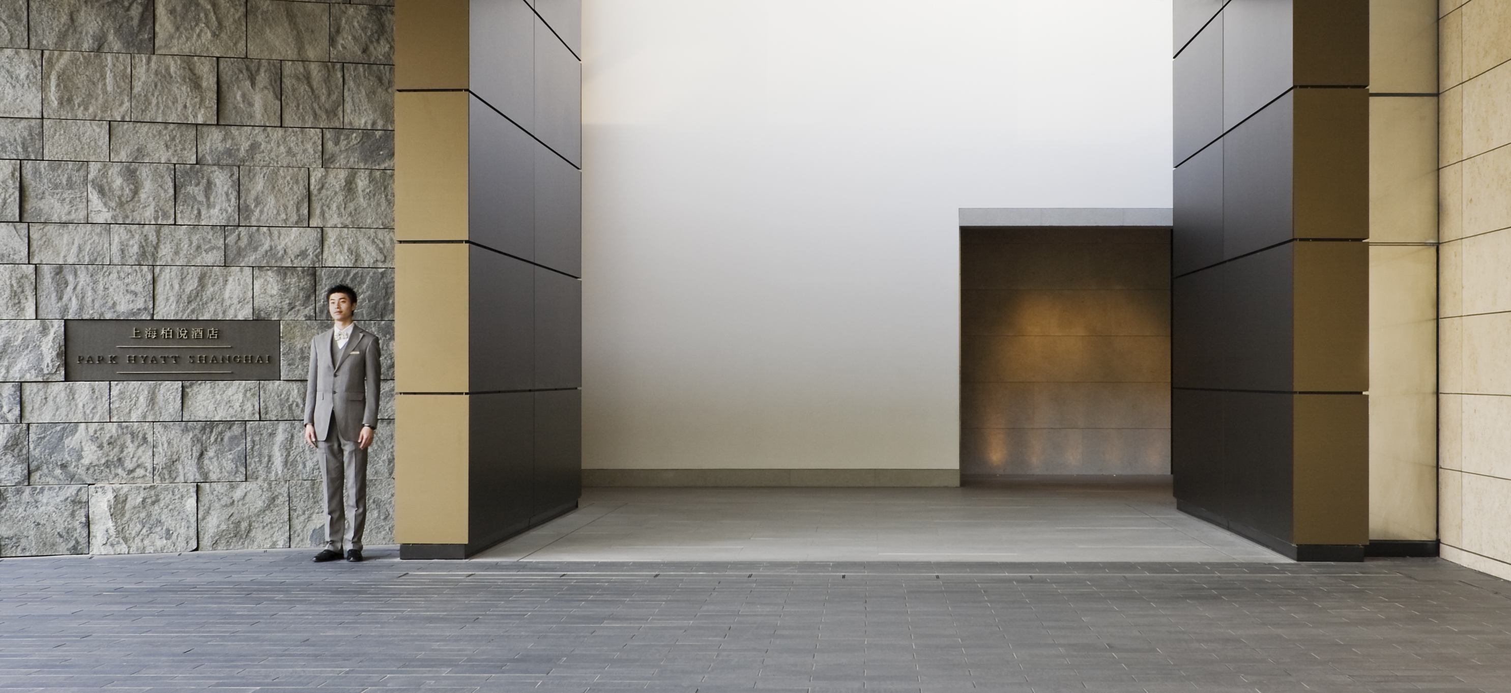 酒店门头的金属栅格有一丝上海柏悦的影子,简约大气,闹中取静。同样的之字形大转角直接保护着入住客人的隐私,是隔绝外界繁扰的经典高层酒店入口设计。