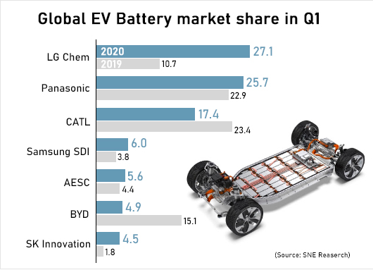 随着装机量大涨,LG化学的全球市场份额从去年一季度的10.7%,上涨到今年一季度的27.1%。