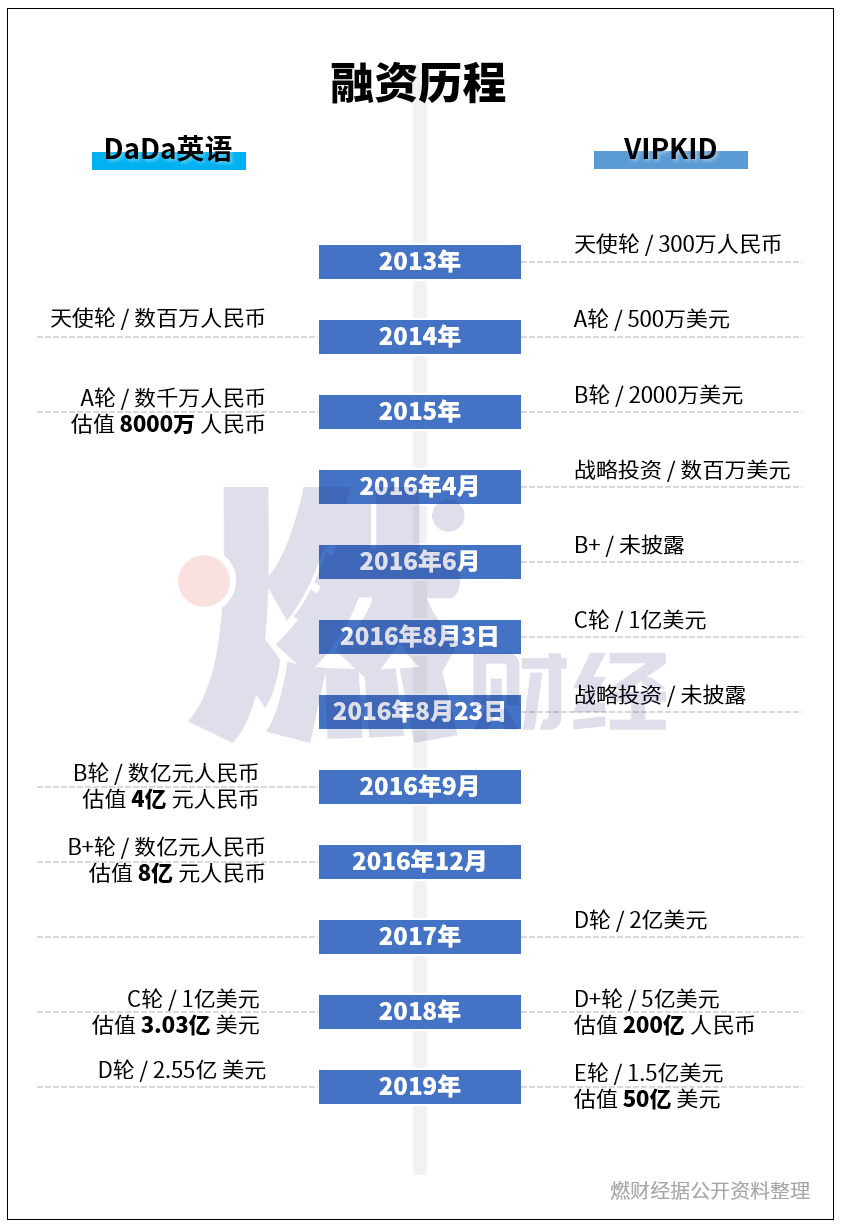 DaDa英语一度被认为是在线英语的二号玩家、VIPKID的劲敌,在被好未来收购前,已经经历了六轮融资,其中不乏华平投资、涌铧投资、老虎环球基金等资本巨鳄。巅峰时期,其营收与估值上都可与VIPKID一较高下。