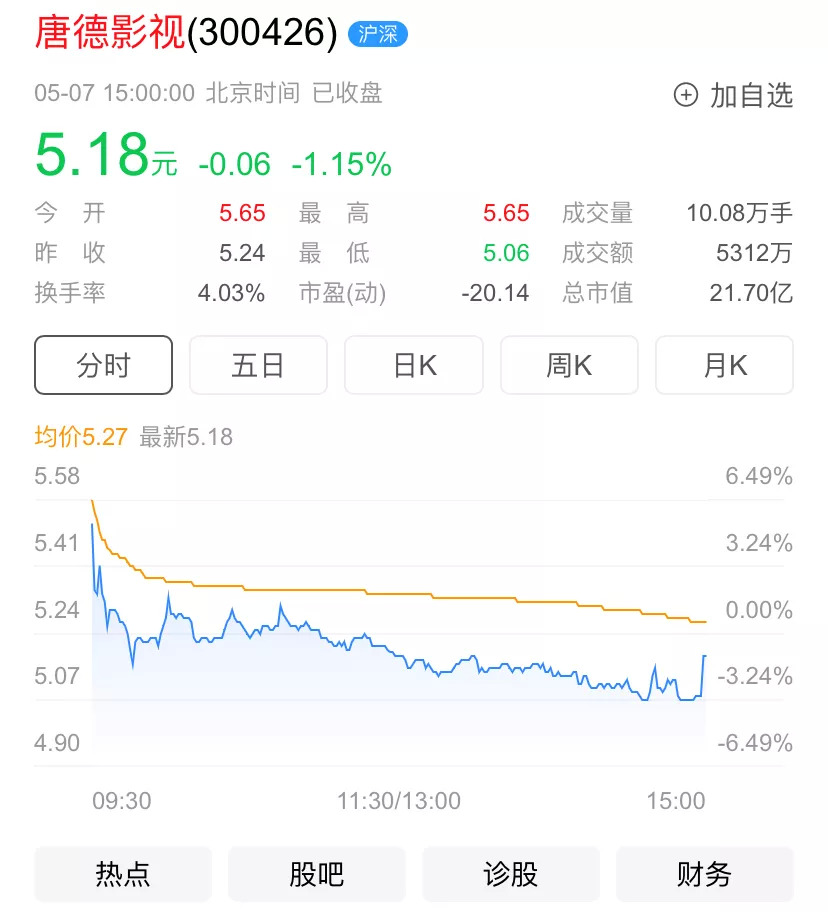 就唐德影视的股价走势来看,资本市场对于唐德此次拟定的交易似乎并不买单,截止至昨日收盘,唐德影视股价下跌1.15%,收盘报5.18元/股。