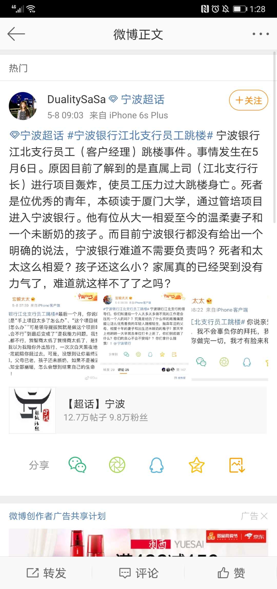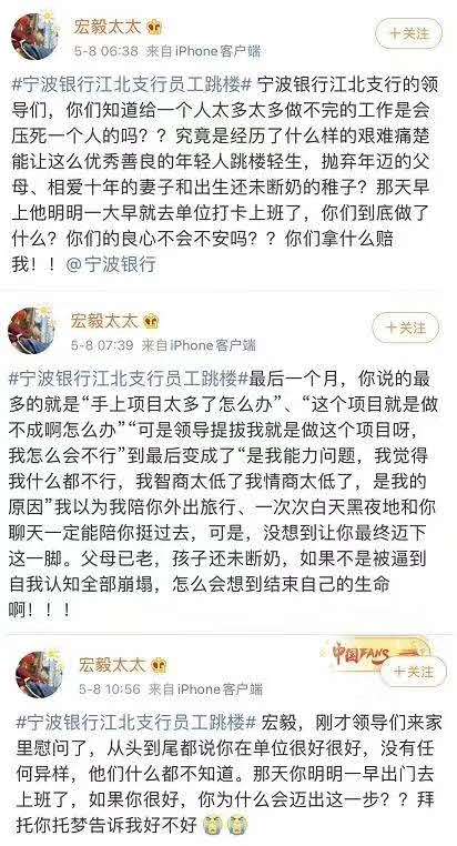 5月8日,网传宁波银行江北支行的一名员工因压力过大跳楼,疑为当事人爱人的微博用户“宏毅太太”就此事连发多条微博。