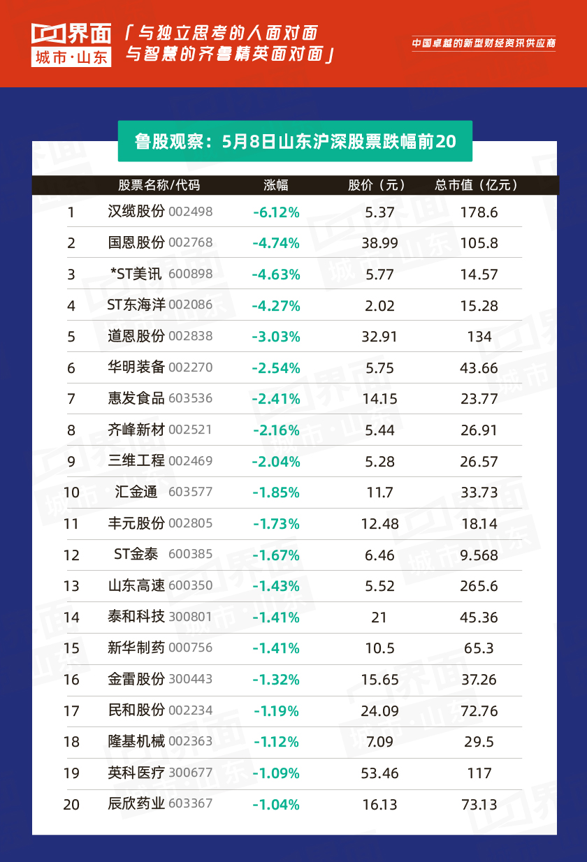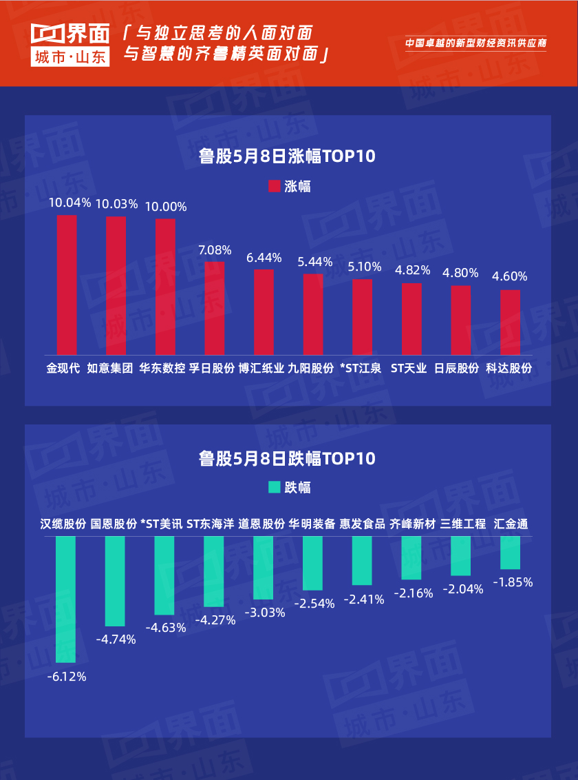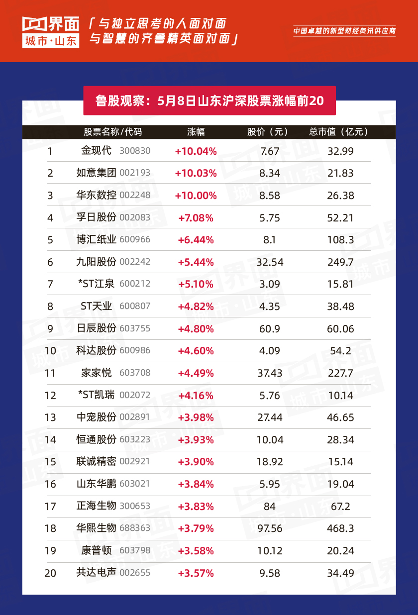 5月8日,山东省内沪深股票有145个股上涨,56只下跌,8只与上一个交易日收盘价持平;