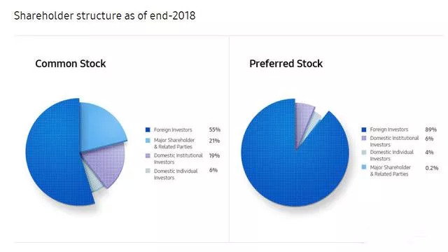 普通股当中,外国投资者占比达到了55%(这里面80%以上的股份是由美国投资机构所持有,特别是华尔街花旗,摩根大通等金融机构), 大股东和关联企业持股比例是21%,而韩国境内机构投资者的持股比例是19%。