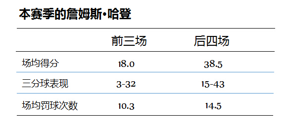 詹姆斯·哈登在新赛季的开局一度陷入泥潭,在前三场比赛中,他场均仅得到18.3分,而火箭也因此遭遇开季三连败。