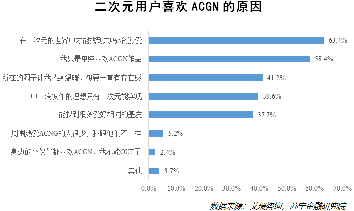根据艾瑞咨询的调研结果,二次元人群钟情动漫是出于对快感和幸福感的积极获取,有63.4%的用户表示喜欢二次元主要是因为在当中能找到共鸣、治愈与爱,还有39.6%的用户表示“中二病”的理想仅能在二次元世界实现。这些还进一步投射出他们面对现实世界各种压力时,内心深处某种潜在的欲望和对难以实现的梦想的执着。