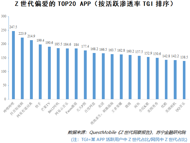 进一步地,我还可以针对Z世代用户偏爱的APP做一番考究。通过对Z世代活跃渗透率TGI指数(某APP活跃用户中,Z世代占比/网民中Z世代占比)这一指标的衡量,可以得到排名前20的APP种类(见下图)。