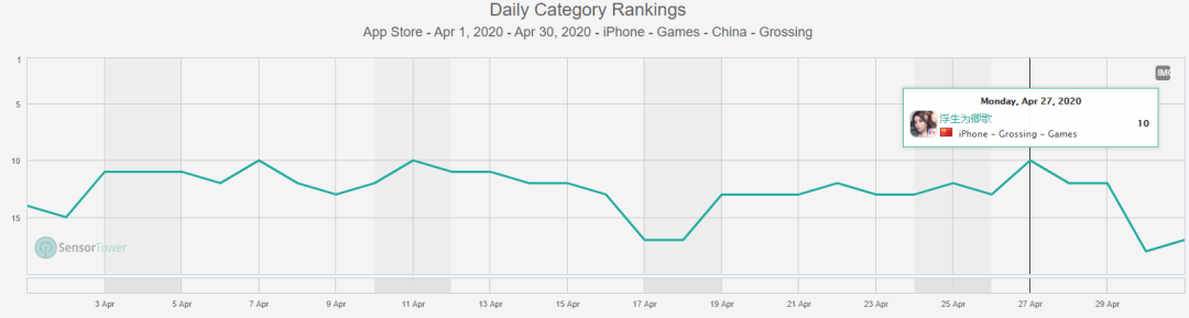 自2月份以来,玩友时代已经连续3个月保持营收的高速增长:2月份厂商成功空降本榜单TOP23,而且在3月的营收环比增长42%,来到4月份更是再度上涨30%...从作为增长主引擎的《浮生为卿歌》4月份在国内iOS游戏畅销榜的排名来看,游戏基本稳定在TOP15以内,并且数度成功打入TOP10。