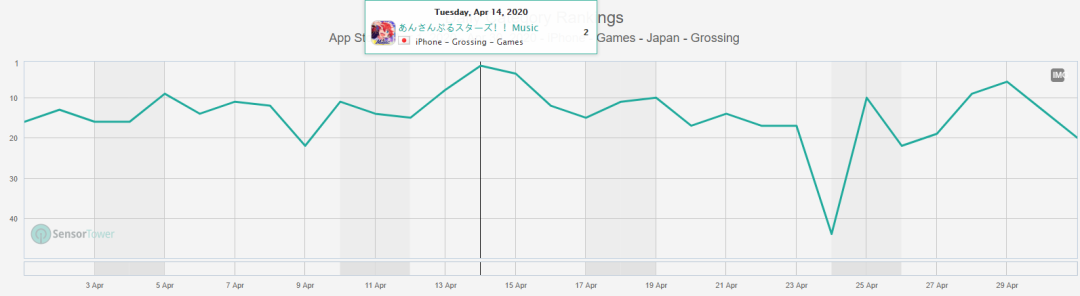 一直深耕日本女性向市场的乐元素在4月份的成绩也相当不错。新作《Ensemble Stars!!Music》(后文简称: 《Music》)自3月登陆日本市场后,收入稳步递增。在4月份,游戏大部分时间都稳守在日本iOS游戏畅销榜TOP20之内,甚至一度冲上了TOP2。