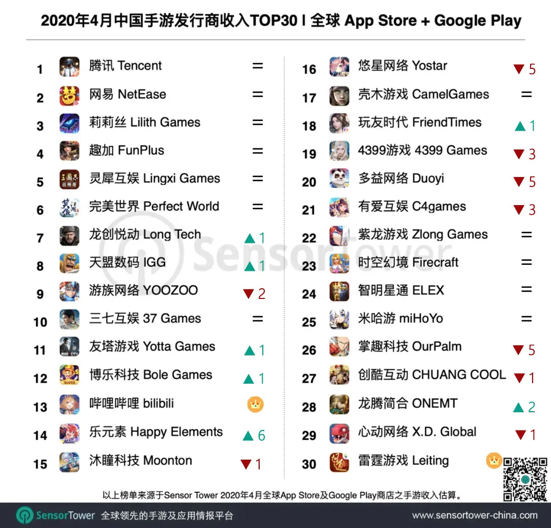 5月8日,SensorTower发布了2020年4月中国手游发行商在全球App Store和Google Play的收入排名。
