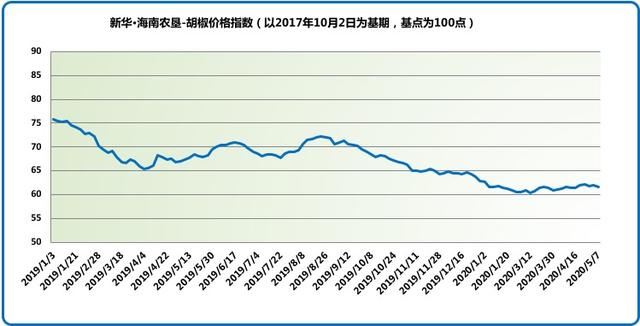 新华·海南农垦-胡椒价格指数显示,本期指数呈现微幅震荡走势,截至5月7日,指数报61.55点,较4月23日(下同)下跌0.51点,跌幅0.82%;较去年同期下跌5.40点,跌幅8.07%。