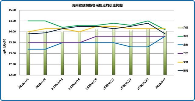 5月7日,海南全省白胡椒加权收购均价为14.04元/斤,下跌0.12元/斤,期内多数主产市县价格下跌,仅定安有所上涨。具体来看,定安均价上涨2.22%,为唯一上涨市县;海口均价下跌2.08%,跌幅最大;万宁均价保持不变;全省各主产市县白胡椒收购均价区间为13.80元/斤至14.15元/斤。