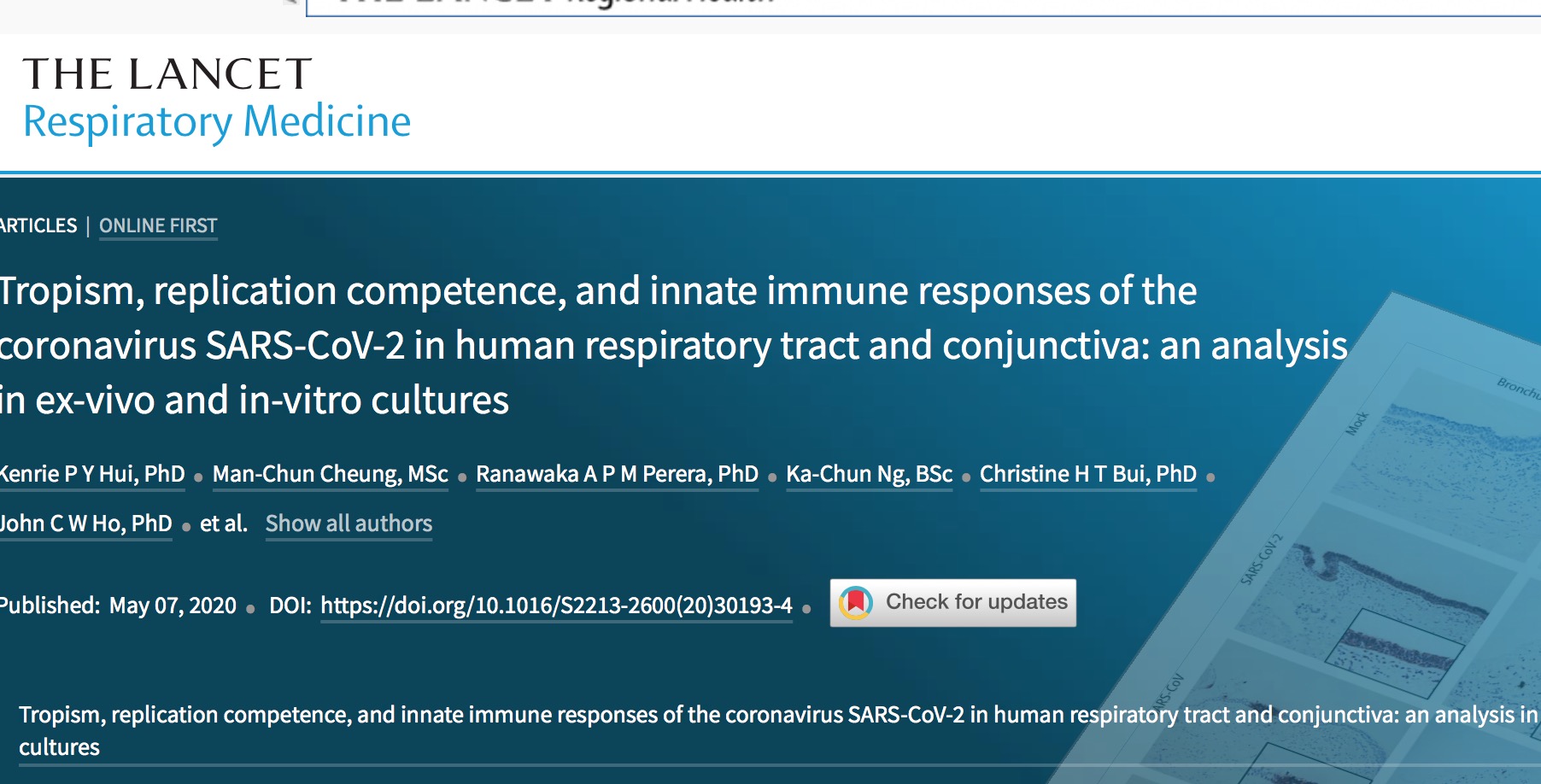 5月7日,医学杂志《柳叶刀-呼吸道医学》发表了香港大学李嘉诚医学院Kenrie P Y Hui等学者题为Tropism, replication competence, and innate immune responses of the coronavirus SARS-CoV-2 in human respiratory tract and conjunctiva: an analysis in ex-vivo and in-vitro cultures的文章。作者表示,文章旨在评估新型冠状病毒在人类呼吸道、结膜中的反应,以提供对新型冠状病毒发病机理的见解。