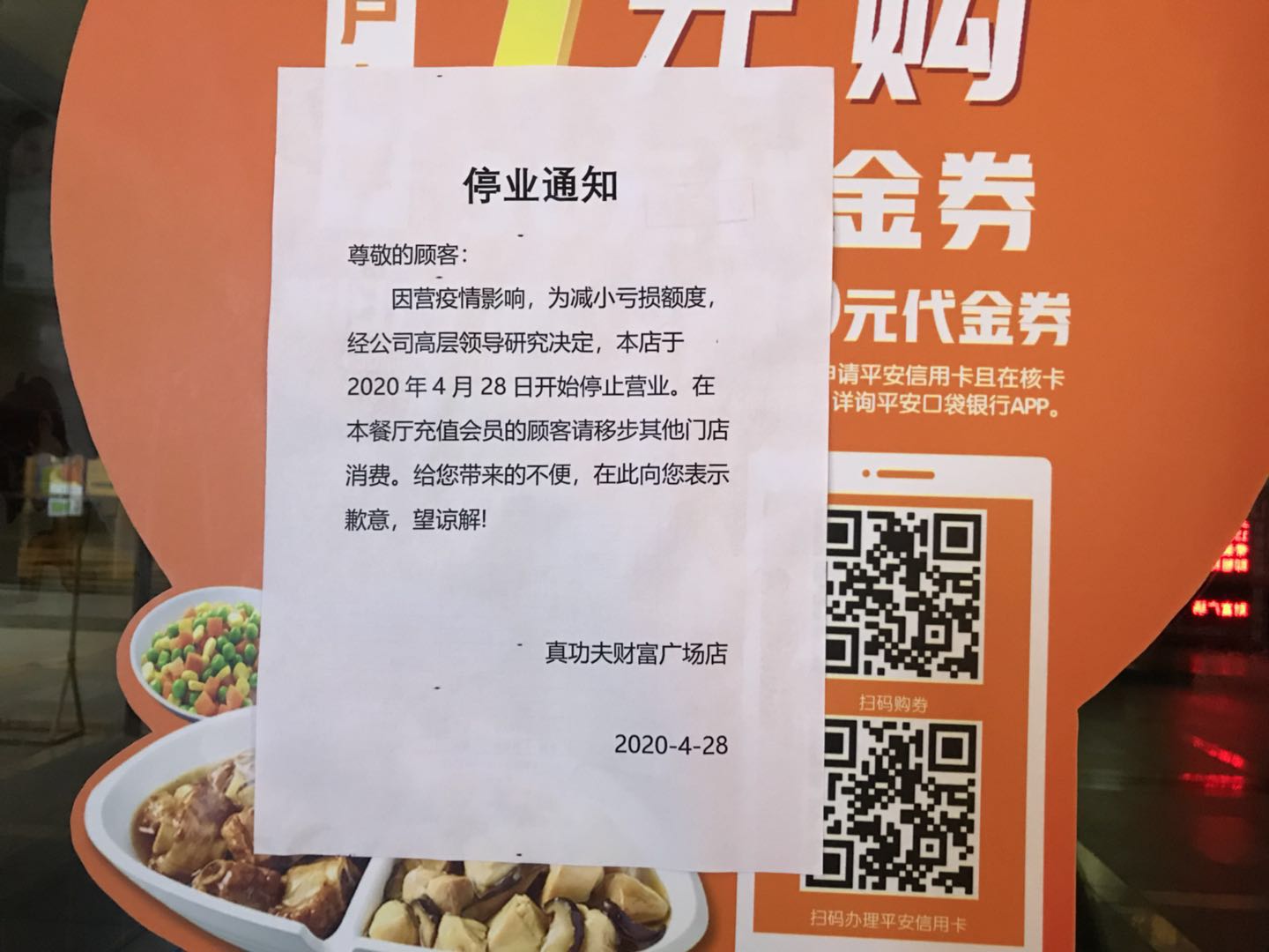 界面新闻日前留意到,真功夫位于广州财富广场门店在近日贴出了结业消息,称为减小亏损额度,公司高层领导决定停止营业。