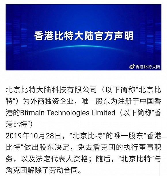 公告指出,2019年10月28日,“北京比特”的唯一股东“香港比特”做出股东决定,免去詹克团的执行董事职务。以及法定代表人资格,随后,“北京比特”与詹克团解除了劳务合同。