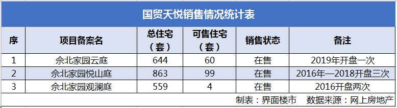 除了质量问题频发,国贸天悦销售情况也并不理想。据界面楼市查询,从2016年开盘至今4年时间,国贸天悦经历4次开盘共计推出房源2066套住宅,网上房地产显示,该项目可售住宅还有163套。