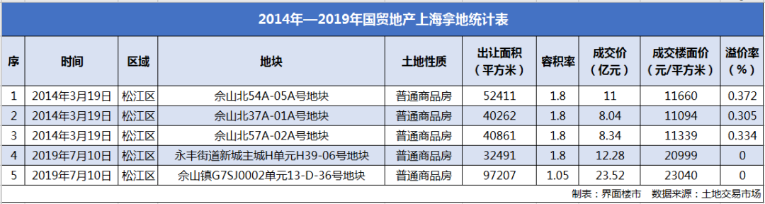 距今最近的一次公开拿地,是在2019年7月,以35.78亿元竞得松江佘山镇G7SJ0002单元13-D-36号地块和永丰街道新城主城H单元H39-06号地块,且均为底价成交。至此,国贸地产已在上海松江布局5个项目。