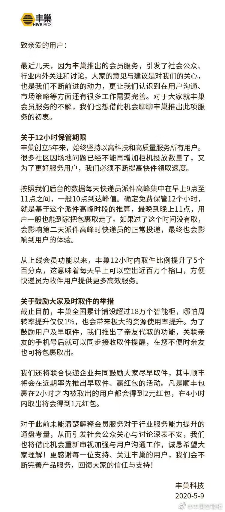 5月9日晚间,因近期推出会员收费服务引发了热议后,丰巢面向用户发布《丰巢会员服务说明》,表示认识到在用户沟通、市场策略等方面还有很多工作需要完善,并对于大家就丰巢会员服务的不解,表达推出此项服务的初衷。