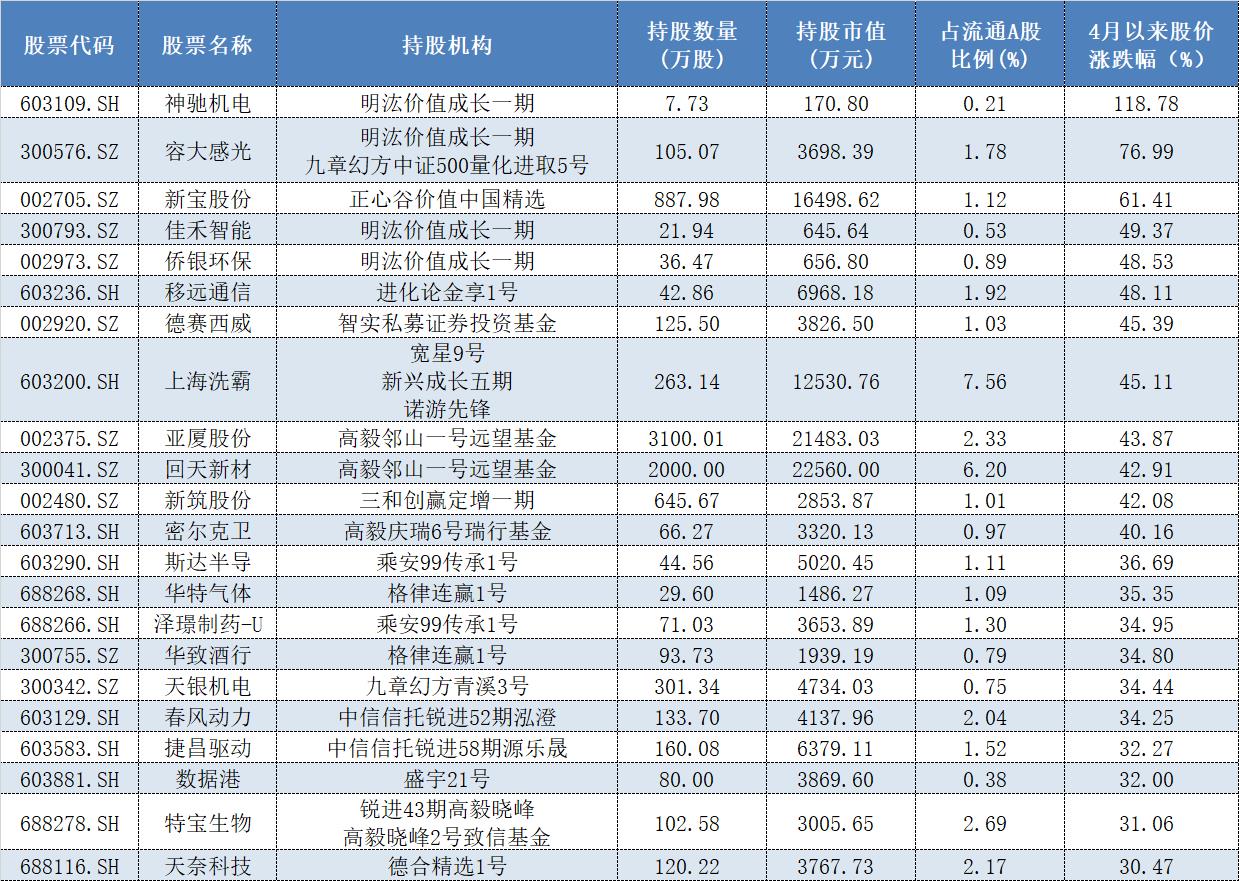 Wind数据显示,以5月8日的收盘价计算,在一季度阳光私募新进前十大流通股东之列的股票中,共有22只股票自今年4月以来的股价涨幅都已经超过了30%。
