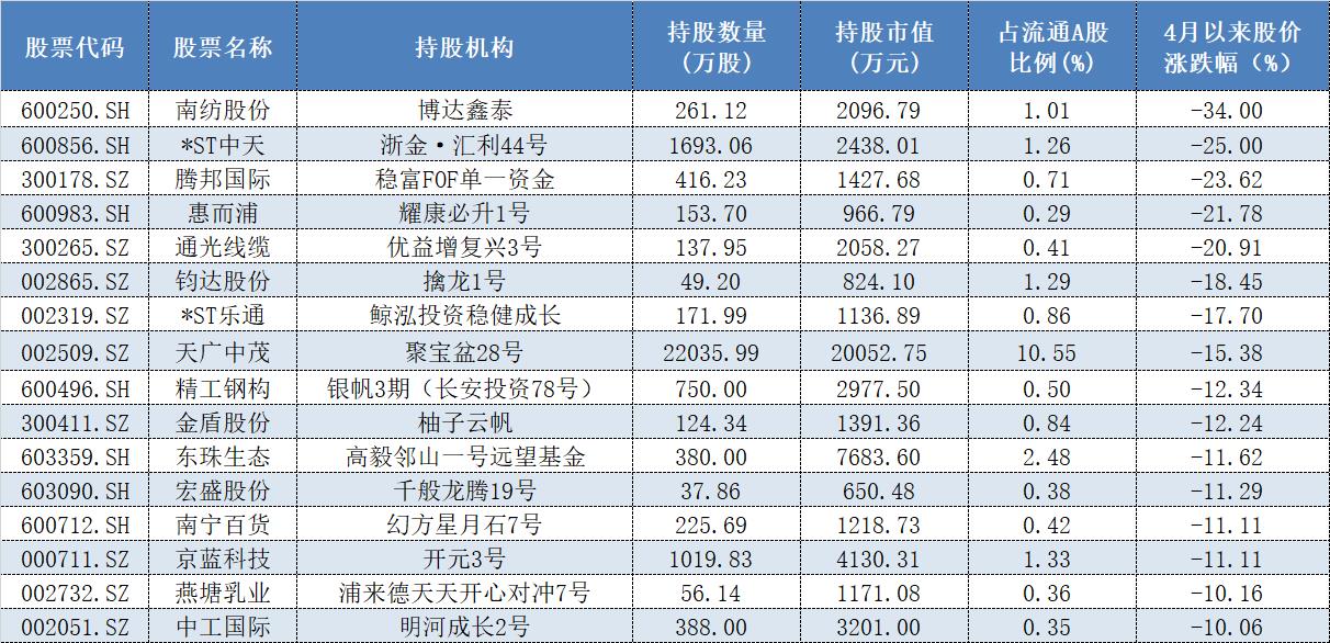 跌幅排在第二位的是聚沙投资旗下“汇利44号”一季度新进成为第十大流通股东的*ST中天,以5月8日收盘价计算,该股自今年4月以来的股价下跌了25%。同时,“稳富FOF单一资金”、“耀康必升1号” 以及“优益增复兴3号”分别在一季度跻身前十大流通股东之列的腾邦国际、通光线缆等3只股票自今年4月以来的股价跌幅也都超过了两成。