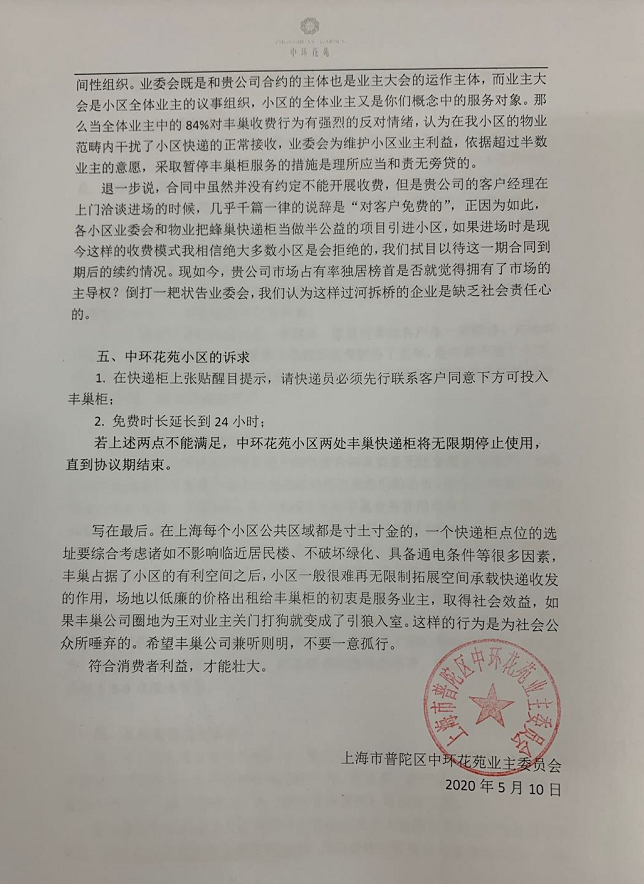 中环花苑小区业委会表示,若上述两点不能满足,中环花苑小区两处丰巢快递柜将无限期停止使用,直到协议期结束。该业委会已于2020年5月8日决议即日起暂停小区内的两台丰巢智能柜的使用。