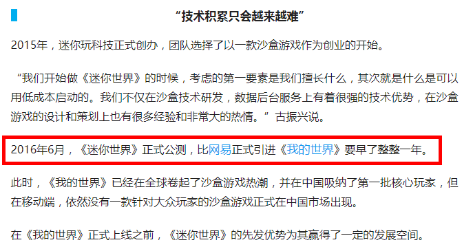 我们仔细翻阅了一下网络,两个游戏比早的事情在2017年8月就开始出现了争论,不过真正的激烈争辩还是从2018年开始,双方各执一词,虽然《迷你世界》出现的游戏时间的确比《我的世界》晚了几年,但是并不妨碍玩家们对此的喜爱。但是为什么《迷你世界》的玩家会如此笃定的表示《迷你世界》早于《我的世界》,其中有很大的可能性是《迷你世界》的玩家将游戏的出现与《我的世界》中国版引进的时间做比较,而这一点,在媒体的采访中,也有类似的说法:
