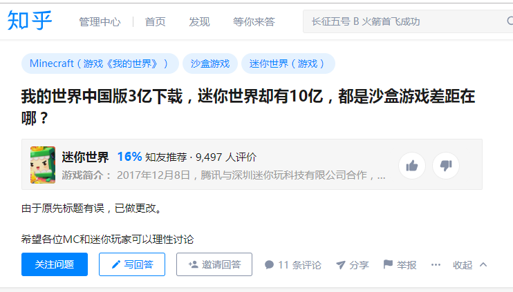 那么,为什么玩家会留言说《迷你世界》的玩家达到了10亿之巨呢?我们翻阅了很多资料,其中,2020年4月10日知乎上有这么一个提问:“我的世界中国版3亿下载,迷你世界却有10亿,都是沙盒游戏差距在哪?”