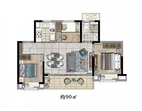 约90㎡户型麻雀虽小,但五脏俱全,做到了舒适度远超市场同类型产品,甚至能比肩大平层般的生活享受。