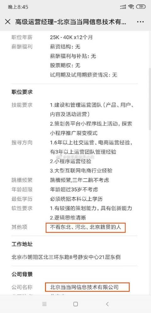 据北青报5月10日报道,日前,一份当当网的“高级运营经理”招聘要求在网络引发议论。该职位要求“年龄超过35岁不考虑”、“不看东北、河北、北京籍贯的人”,不少网友表示上述要求不合理。澜亭律师事务所合伙人张耀律师对记者表示,该招聘信息涉嫌就业歧视,违反了我国《劳动法》和《就业促进法》的相关规定。