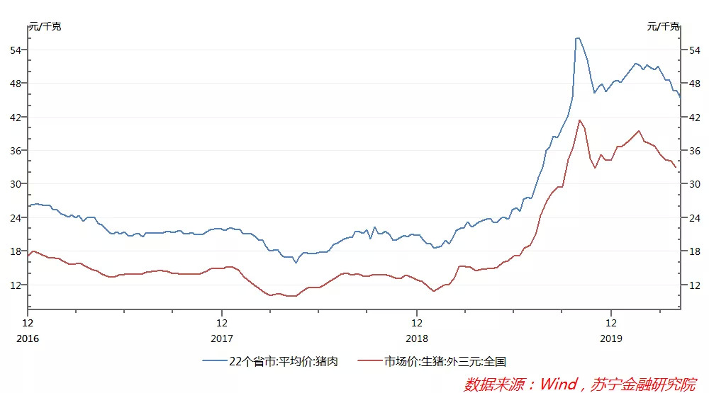 诱惑大企业入局的原因,首先让人想到的是今年各养猪企业的“爆利”。2019年6月以来,猪肉价格猛涨,到年底以及今年年初猪肉价格有所降低,疫情期间猪肉价格还是居高不下,直到最近猪肉价格才回到每公斤45元附近,但和往年比还是不低(见下图)。很多猪肉公司今年初声称去年一年的净利润是往年利润的N倍,甚至是自公司成立以来历年所有利润的总和。