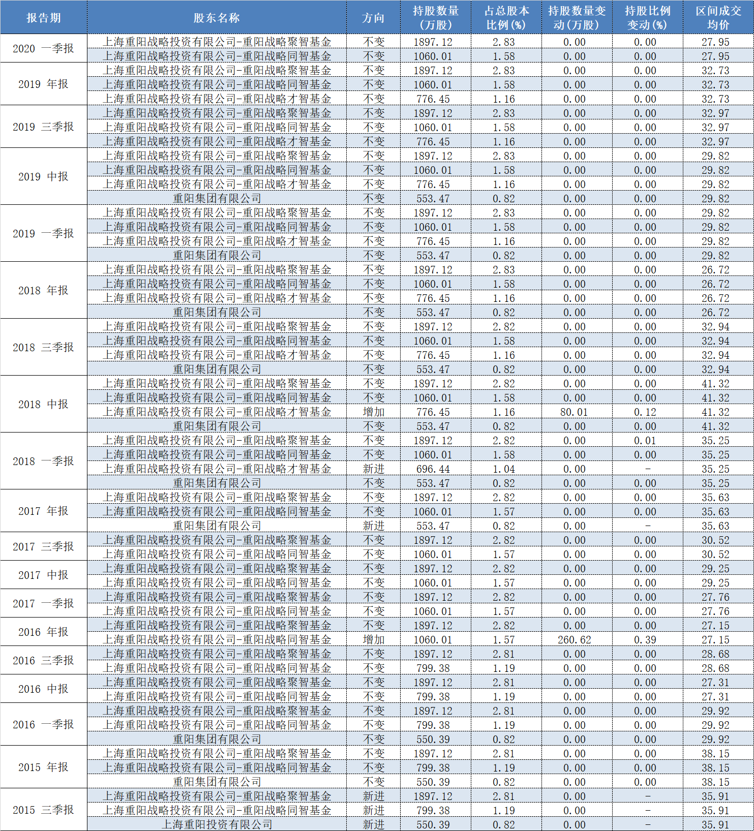 重拳出击之后,重阳投资一直活跃在上海家化前十大流通股东名单上。