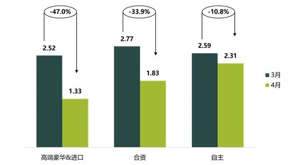 乘联会数据显示,4月豪华车零售同比增长16%,消费升级的高端换购需求迅速回暖,不排除部分车型以价换量,继续形成降维打压态势。4月主力合资品牌零售增速下降5%,自主品牌零售下降13%。本月主流合资品牌与自主品牌领军品牌的走势总体较强,但车企零售分化越加明显,部分中小车企生存艰难。