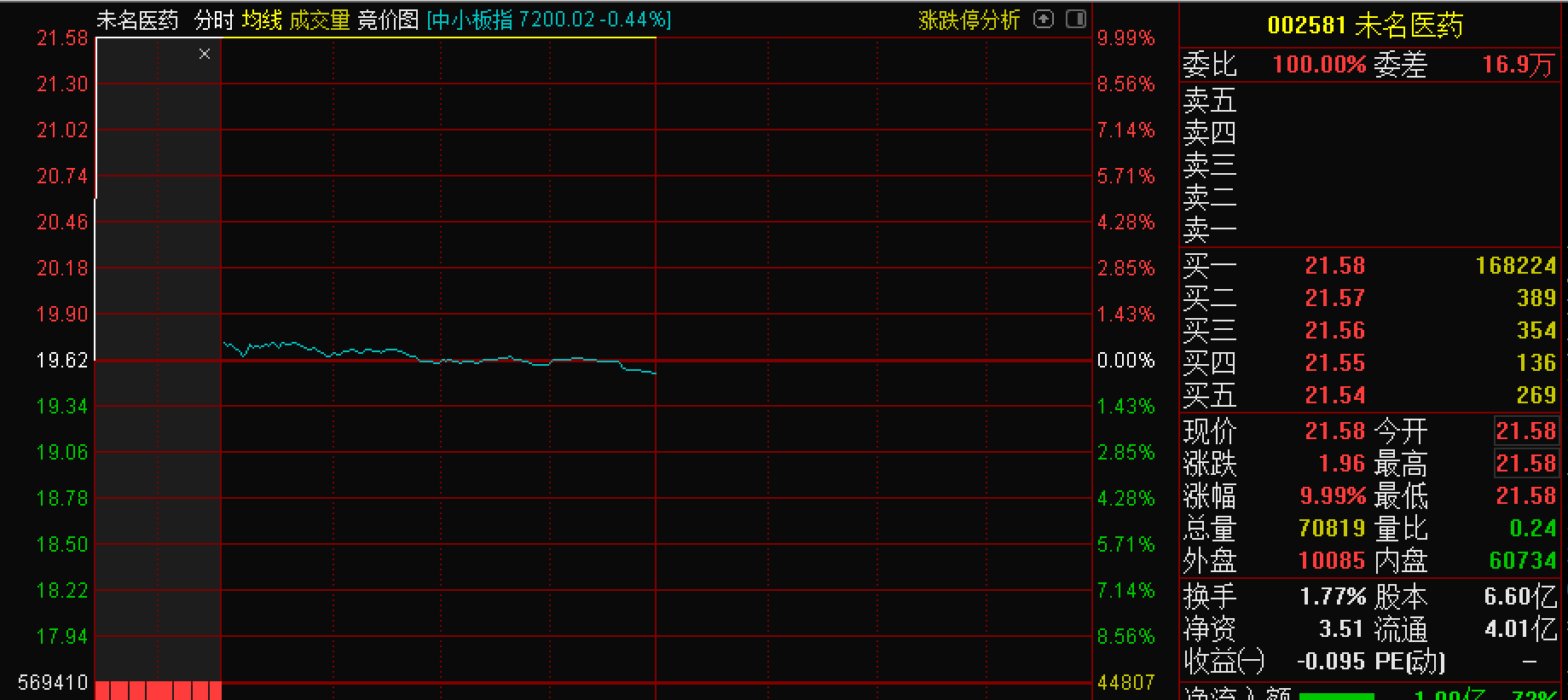 盘面上,结束了短暂的调整之后,未名医药在集合竞价期间就已经被众多买单推至涨停位,截至上午收盘时,在涨停板排队的买单有16.82万手之多,堆积的资金额3.63亿元。