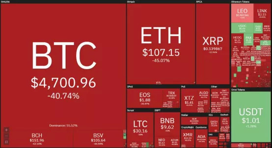 北京时间2020年3月12日晚间六点开始,比特币经历了颇为壮观的血洗之夜,价格如同泄洪一般,接连跌破7000美元、6000美元、5000美元关口。到了3月13日早间,各大平台比特币价格均跌至4800美元下方,24小时跌幅高达40%,创2019年4月以来新低。