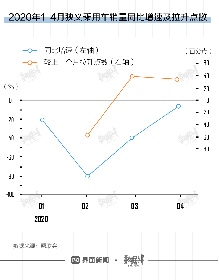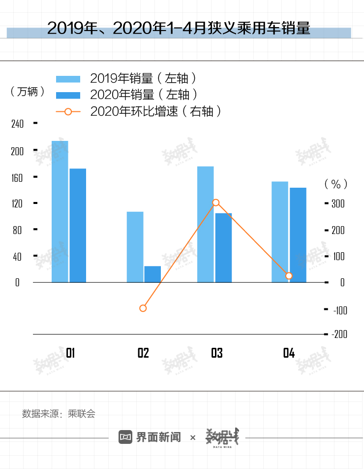 对比去年销量,界面数据发现,今年以来,受疫情影响,乘用车销量在2月受到重创,狭义乘用车当月销量25万辆,同比下降近80%,是前4月乘用车累计销量的主要“拖累”。