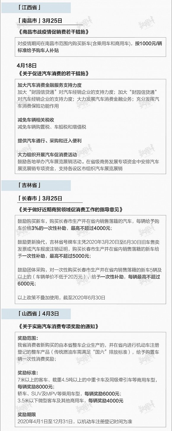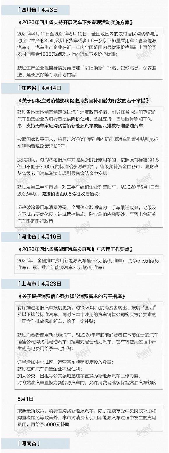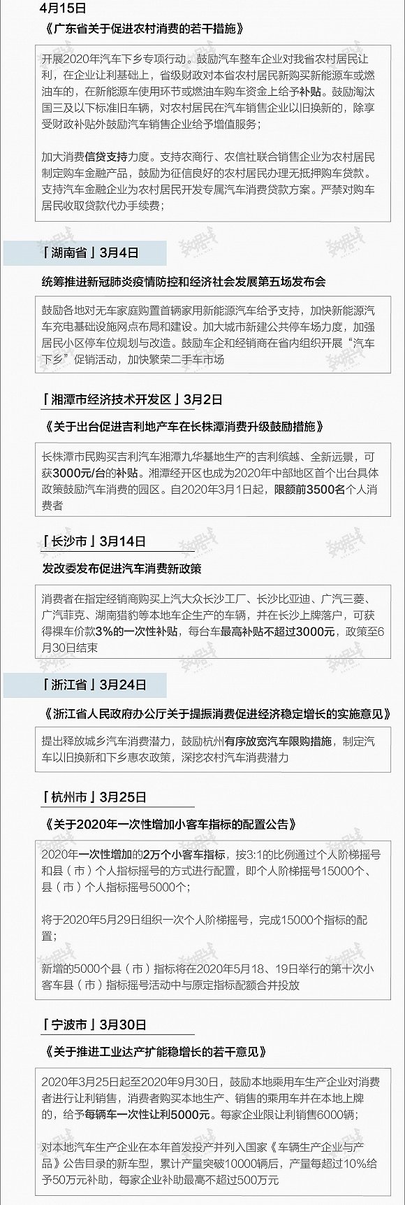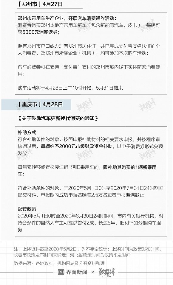据此前界面数据不完全统计,截至2020年5月2日,为应对疫情给车市带来的冲击,至少有12个省(市)及12城发布针对汽车消费的刺激政策。其中,仅使用“现金补贴、优惠”的政策占比在六成以上。
