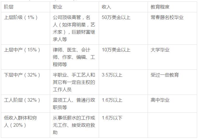 后来的学者还对中产阶级群体进行了细分,比如上层中产阶级和下层中产阶级。虽然各个学者对中产阶级划分有不同的标准,但是相同的是他们都是根据家庭年收入、从事的职业、教育程度来划分的。受过大学教育是中产阶级的最基本的一个条件。下面是引用百科全书上一个学者对中产阶级的标准: