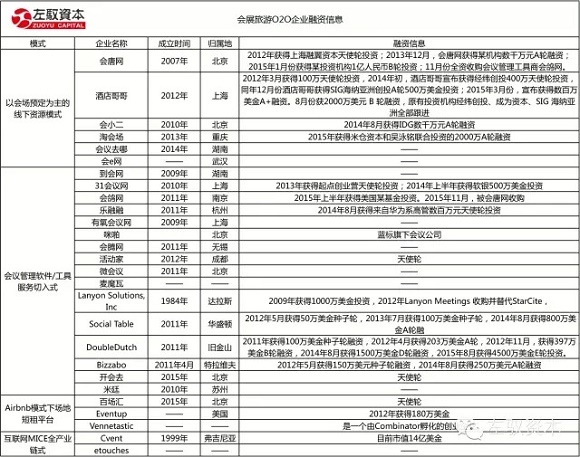 左驭资本通过对国内外会展旅游O2O大盘点,发现市场存在国内巨头系、本帮创新系、外企系,而商业模式主要有五种:互联网MICE全产业链布局模式、以会场预订为主的线下资源式、旅行社和公关公司等专业会展旅游服务公司模式、Airbnb共享经济场地短租平台模式、会议管理工具服务切入模式。