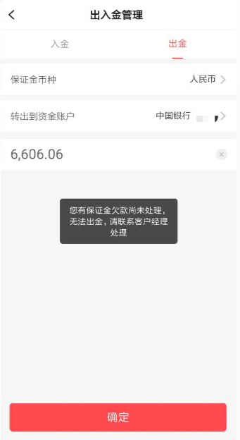 但有投资者向界面新闻记者表示,虽然APP上显示这笔钱已到账,但无法进行转出操作。页面显示其还有保证金欠款未处理,无法出金,请联系客户经理。据该投资者反映,其客户经理的说法是先不要着急,需要后续中行总行统一操作。