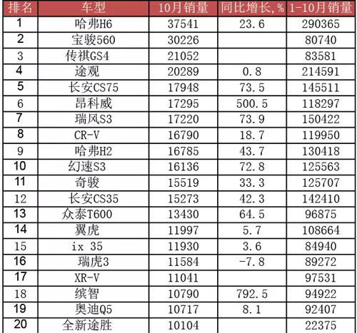 没办法,排在第一的神车哈弗H6实在太凶悍,销量达到37541辆,环比增幅高达23.6%。