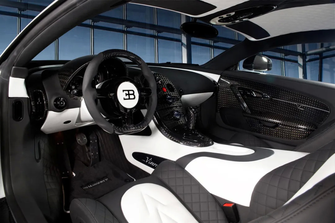 威龙是布加迪上一代终极跑车,本来就没太多可以挑剔的地方。外观上,Mansory换上了大量碳纤维制成的覆盖件,黑色的基本都是碳纤维。作为呼应,车内同样是珍贵的白色皮革和黑色碳纤维的搭配。
